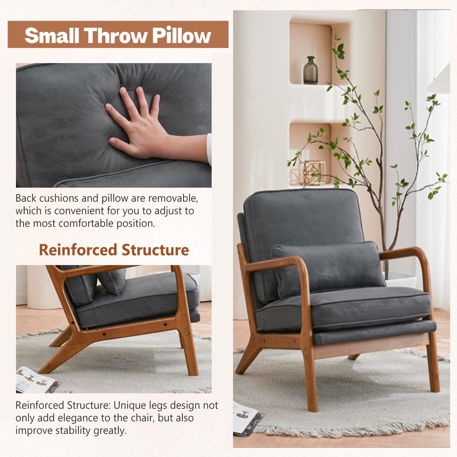 - COMFORT FABRIC: The seat and back cushions of the accent chair are padded with dense foam, to provide you comfortable sitting experience and make you feel relaxed. Back cushions and pillows are removable, which is convenient for you to adjust to the most comfortable position. The covers of the cushions are detachable