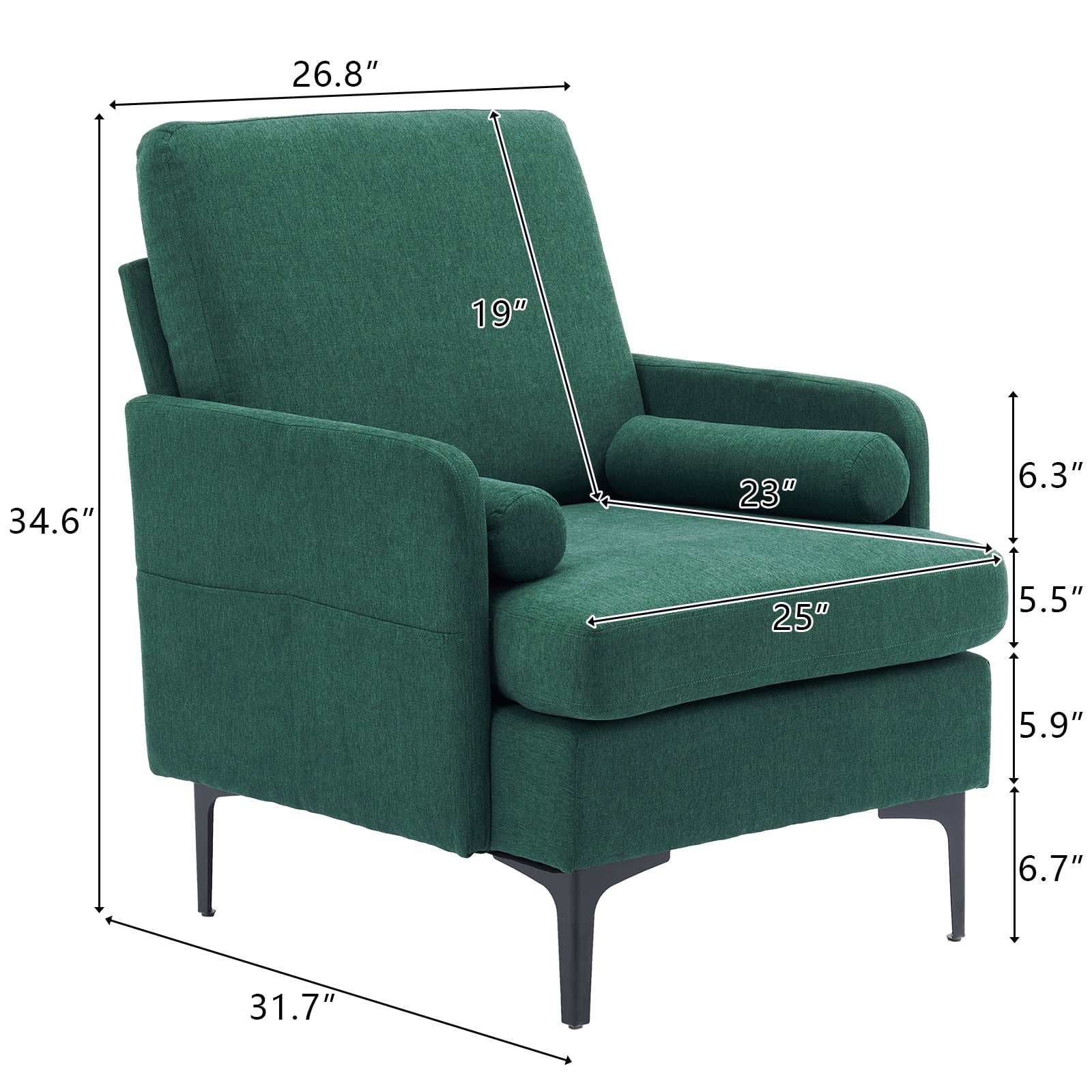 - For seating area: 25"W*23"D*19"; Seating Cushion Height: 5.5"; Seating to floor Height: 18.1"; Overall Dimension: 26.8"W*31.7"D*34.6H"; Maximum Weight Capacity: