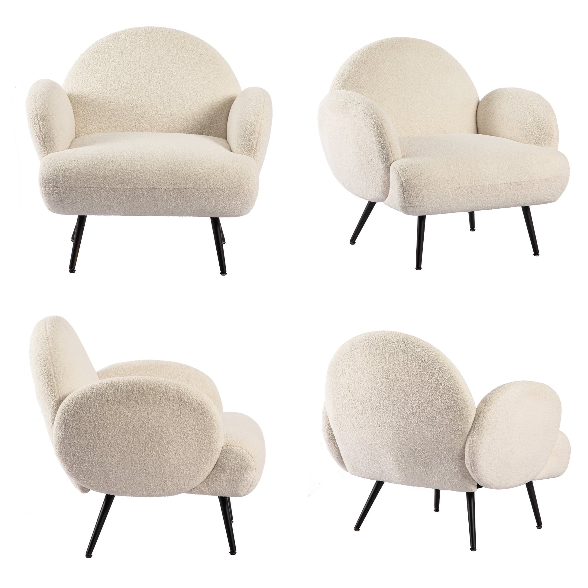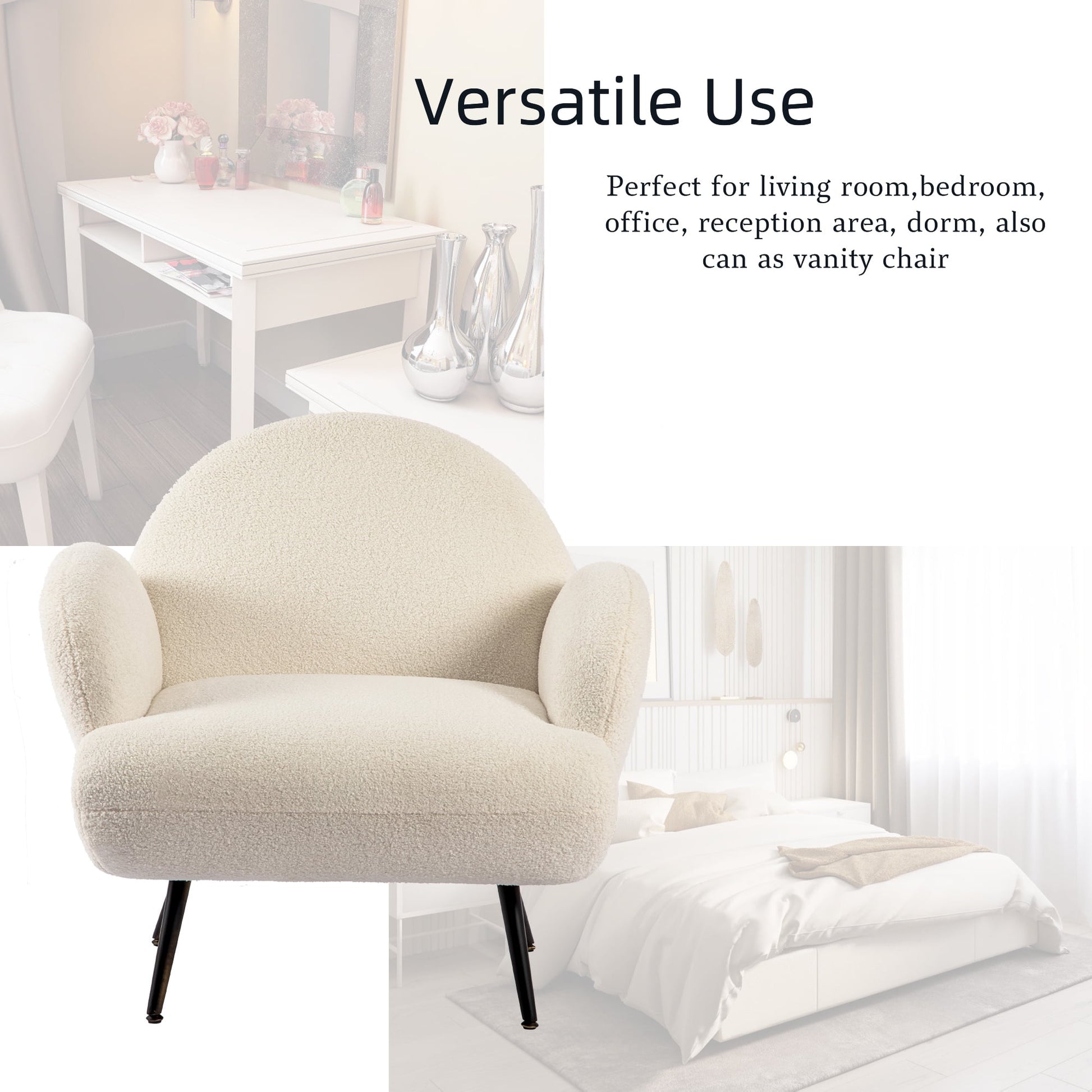The modern accent chair as a whole using teddy tufted fabric, soft and comfortable to the touch, you will touch the comfortable fabric. The armchair cushions are filled with thickened high-density sponge, which has good support and resilience, you will feel more comfortable to sit on. Accent chair can meet the needs of different scenes and different decoration styles, you can use in the living room, bedroom, meeting room, study, office. The teddy Sherpa chair has thick gold metal legs to provide good support and the bottom is designed with non-slip adsorption points to prevent sliding and protect your floor at the same time. The accent chair comes with detailed assembly instructions and requires only a few simple steps to complete the assembly.