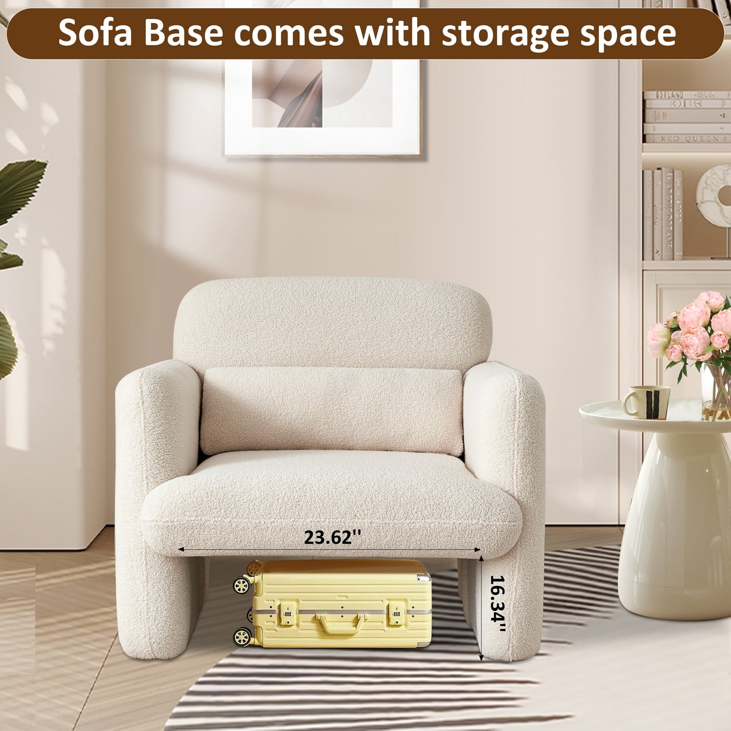 :The bottom space of the modern accent chair can be used for a small suitcase or as a storage space for children's toys